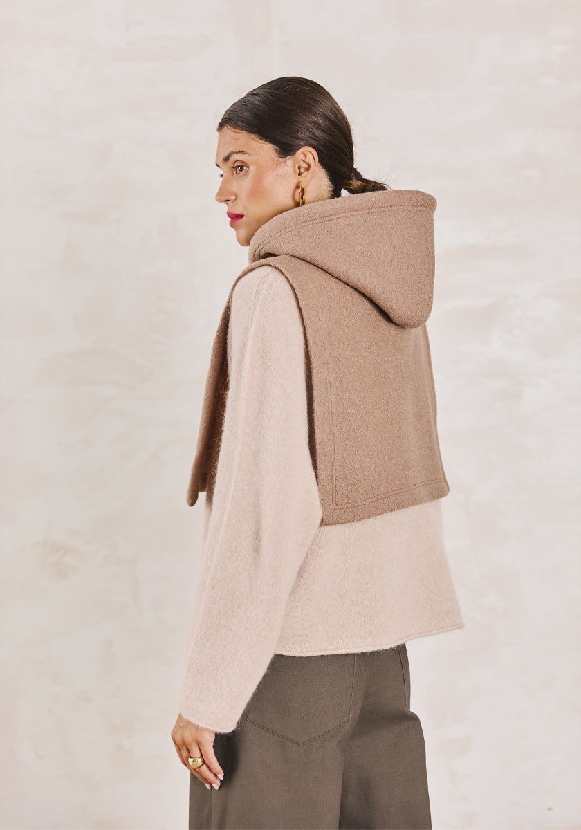 Une pièce en 100 % laine, couleur biscuit, au détail unique de lien avec pression qui vient souligner le col.