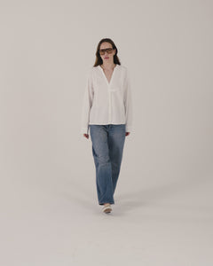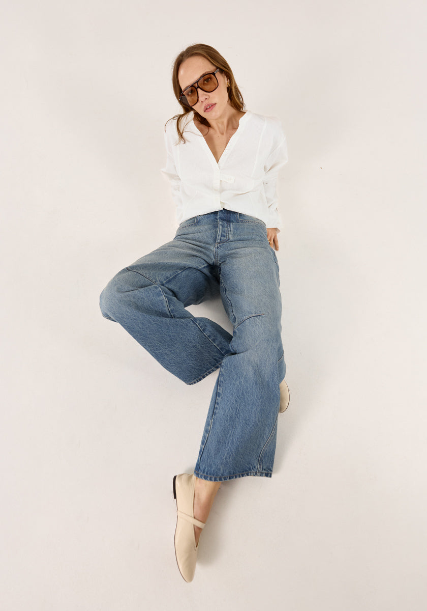 Pour les clientes qui ont l'œil, le reconnaitront ! DEMPE, c'est la forme DEMPSEY d'il y a quelques années, revisitée dans un nouveau tissu. Confectionné en seersucker 100% coton d'origine française, il affiche une texture unique et un coloris doux. Ses emmanchures basses et son volume légèrement loose créent une silhouette décontractée et moderne. Les petites pattes à l'avant signent l'ADN SŌNGE avec élégance.