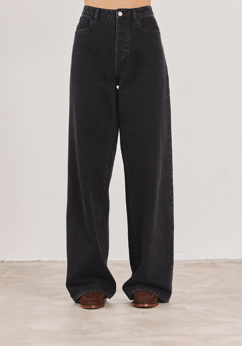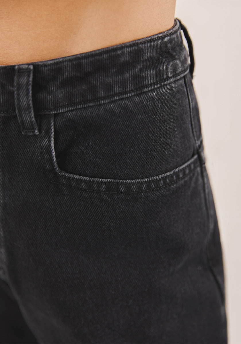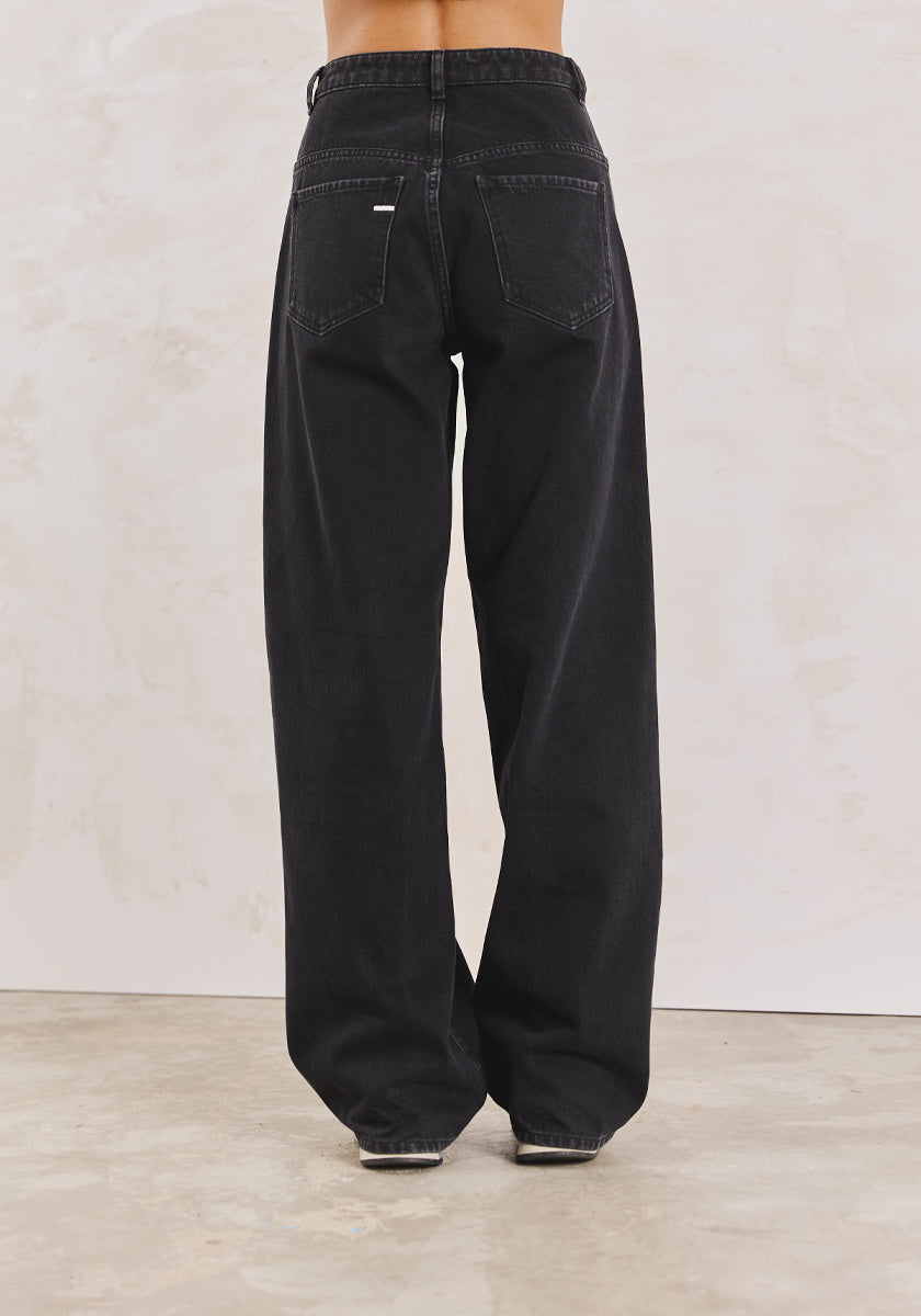 BISPO black stone, le jean à la coupe large et au style affirmé. Sa toile 100% coton, souple et confortable, offre un tombé parfait et un délavage unique. Des détails précis, des lignes nettes : un essentiel qui structure vos looks de saison.