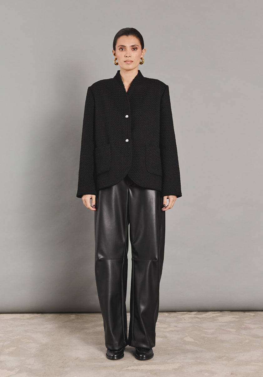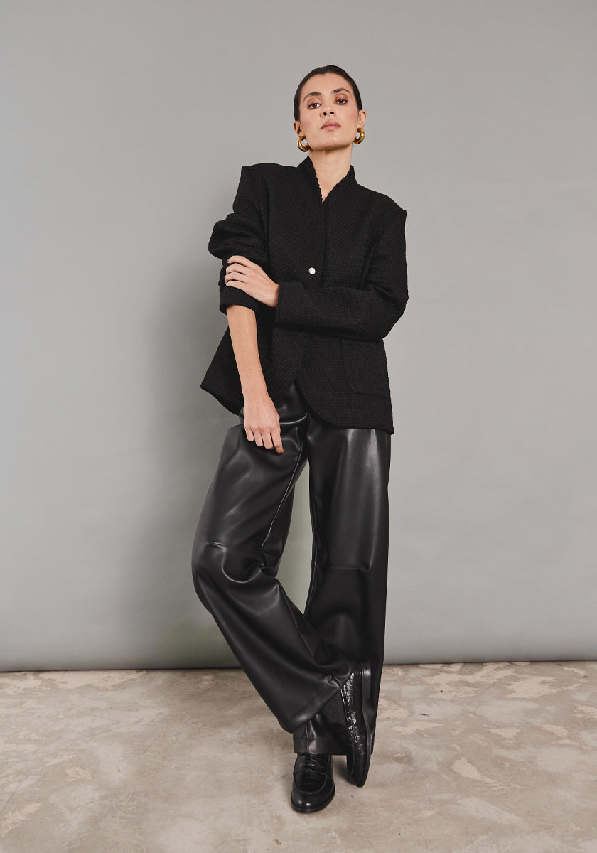 Le pantalonMESTRE simili black allie style et confort avec sa coupe légèrement ballon et ses poches carrées inspirées du jean. Confectionné en simili cuir européen, il structure la silhouette et apporte une allure moderne et sophistiquée, parfaite pour un look du soir.