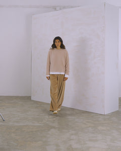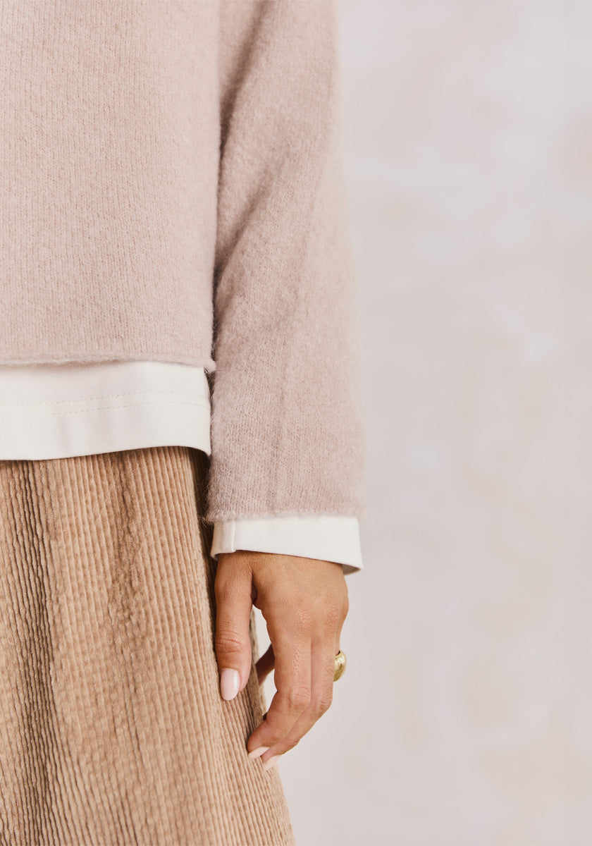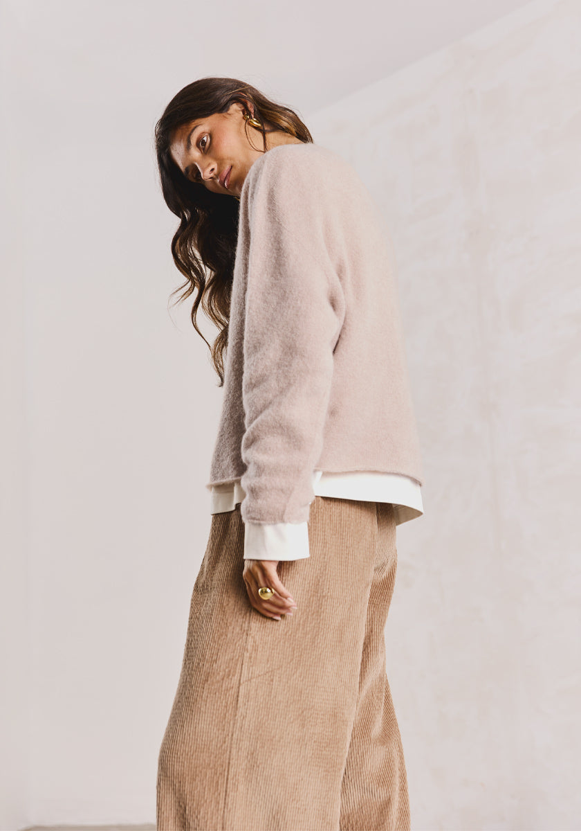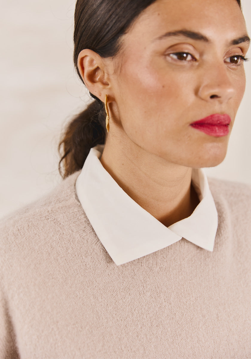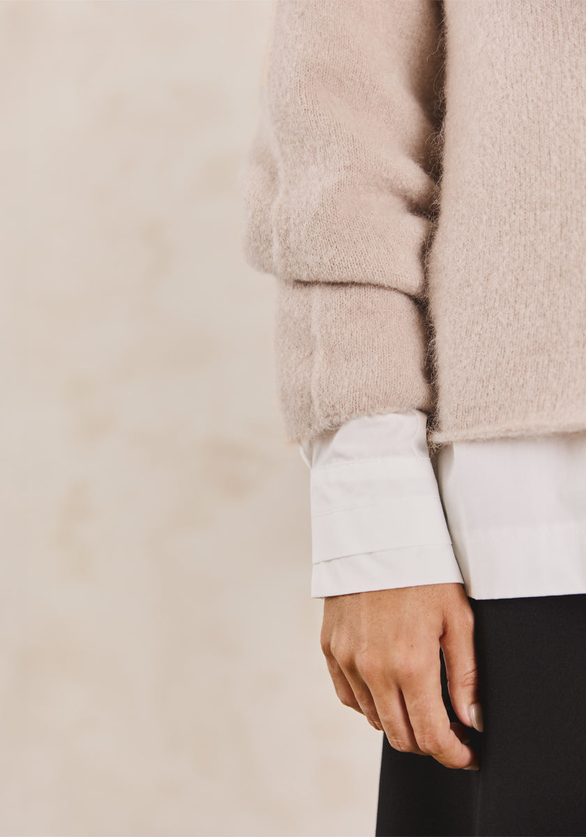 Confectionné dans une maille douce et aérienne en laine et alpaga, c'est le pull parfait pour les matins frais, sublimé par un détail bord côte au col qui capte le regard. Minimaliste et affirmé, il devient la base idéale pour superposer vos pièces préférées.