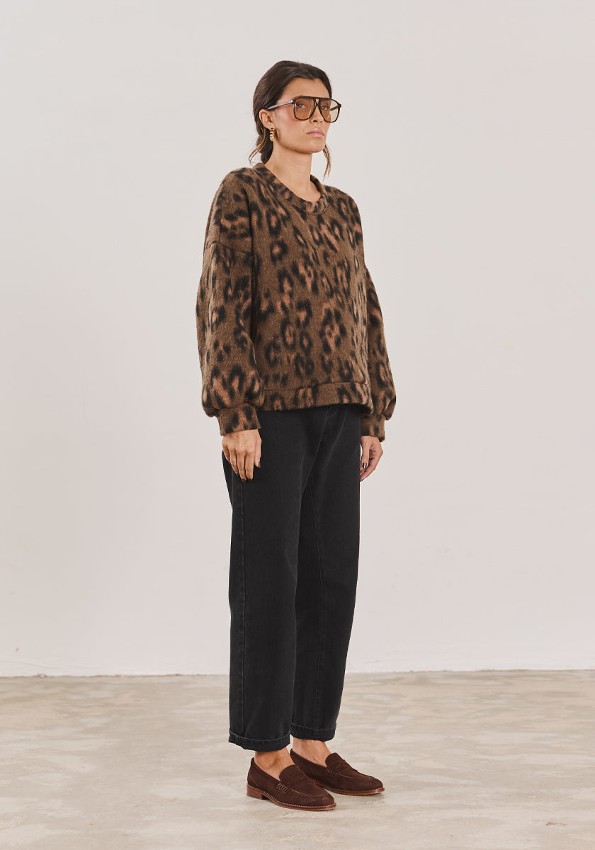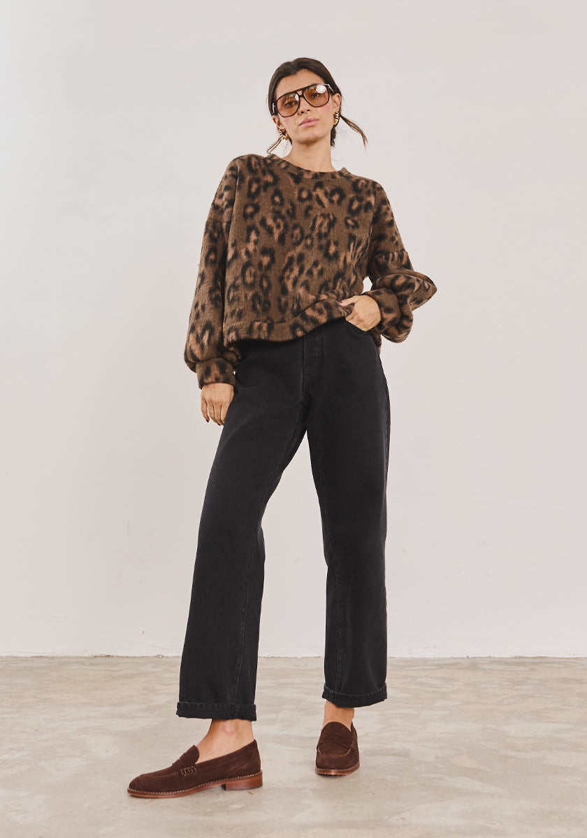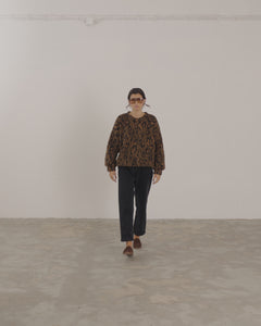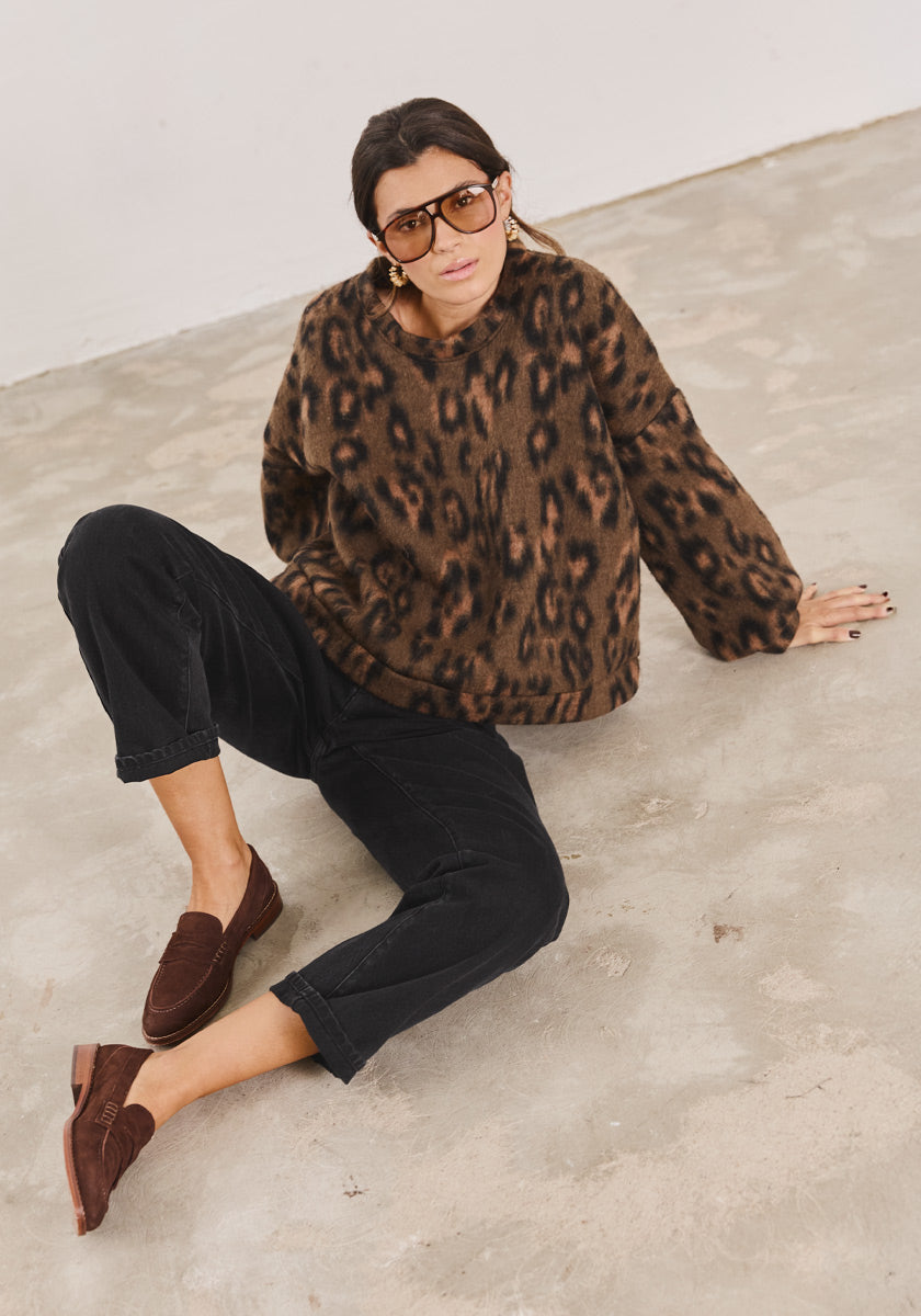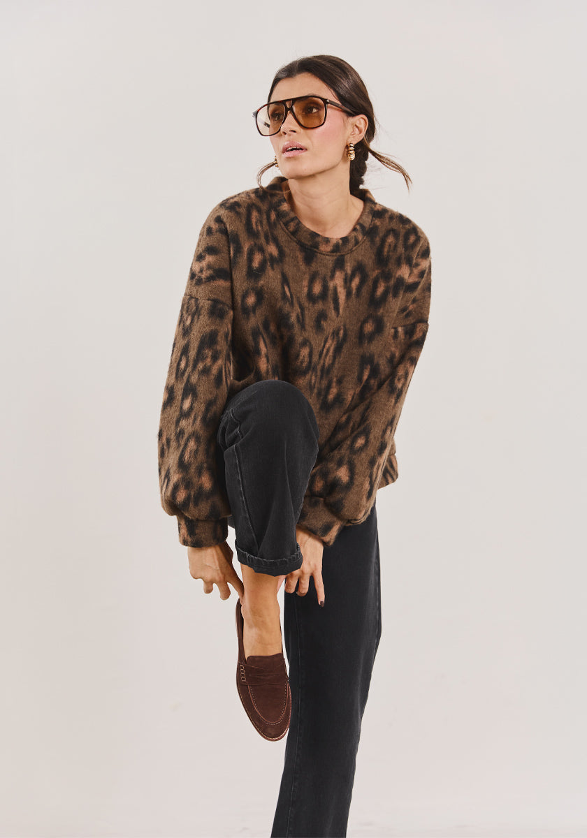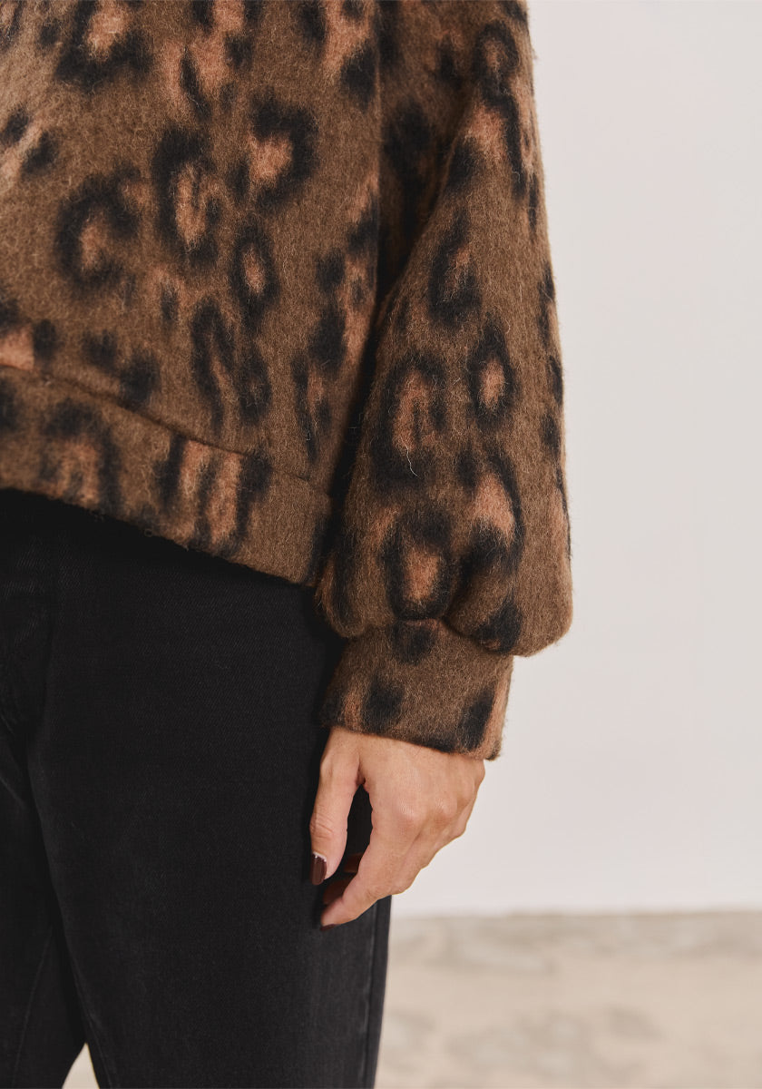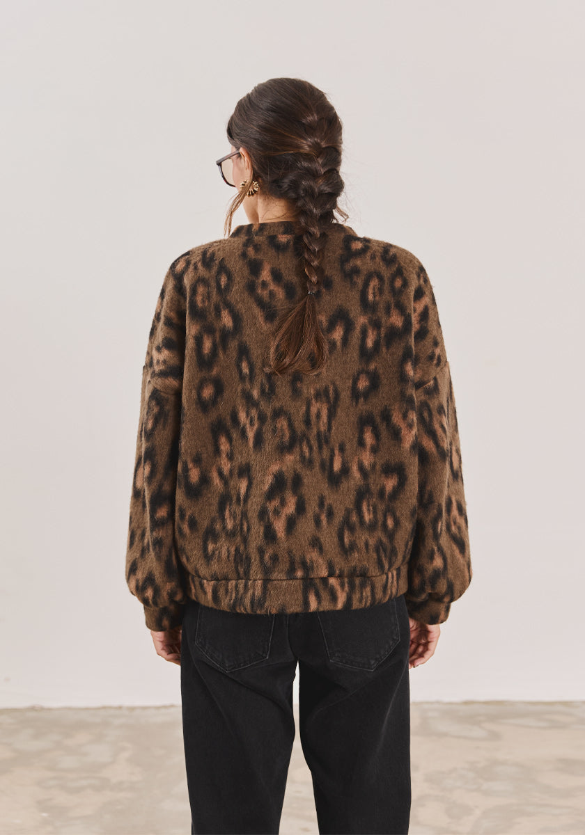 Confectionné dans un tissu effet fausse fourrure ultra doux, DIAS combine confort et allure. Sa coupe ample et ses manches resserrées aux poignets apportent structure et féminité, tandis que le motif léopard camel et noir dynamise vos tenues hivernales.