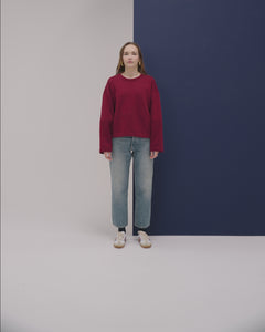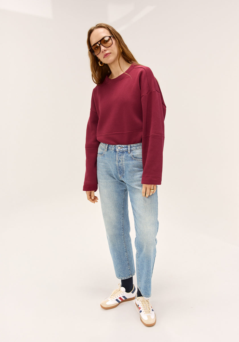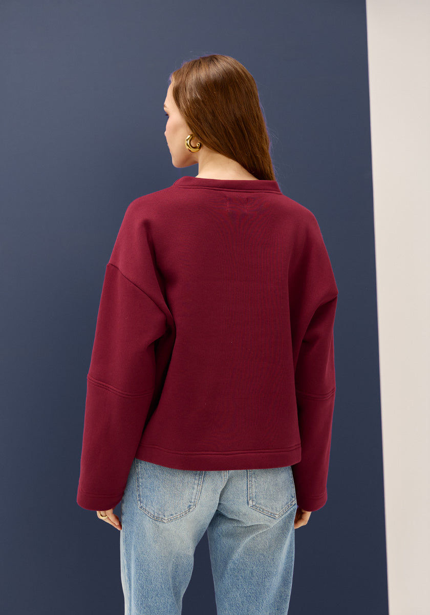 Ses découpes et surpiqûres graphiques structurent le devant et les manches avec modernité. La forme boxy aux emmanchures basses garantit un confort absolu, tandis que le bordeaux profond réchauffe vos looks d'hiver avec intensité. Le sweat qui donne du corps à la décontraction.