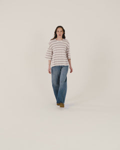 Confectionné en 100% coton, il affiche une coupe épurée. Ses emmanchures tombantes et ses manches longueur coude créent une silhouette décontractée et moderne. Les rayures graphiques apportent du caractère sans effort. AVEI stripes incarne le basique parfait, simple, confortable, intemporel.
