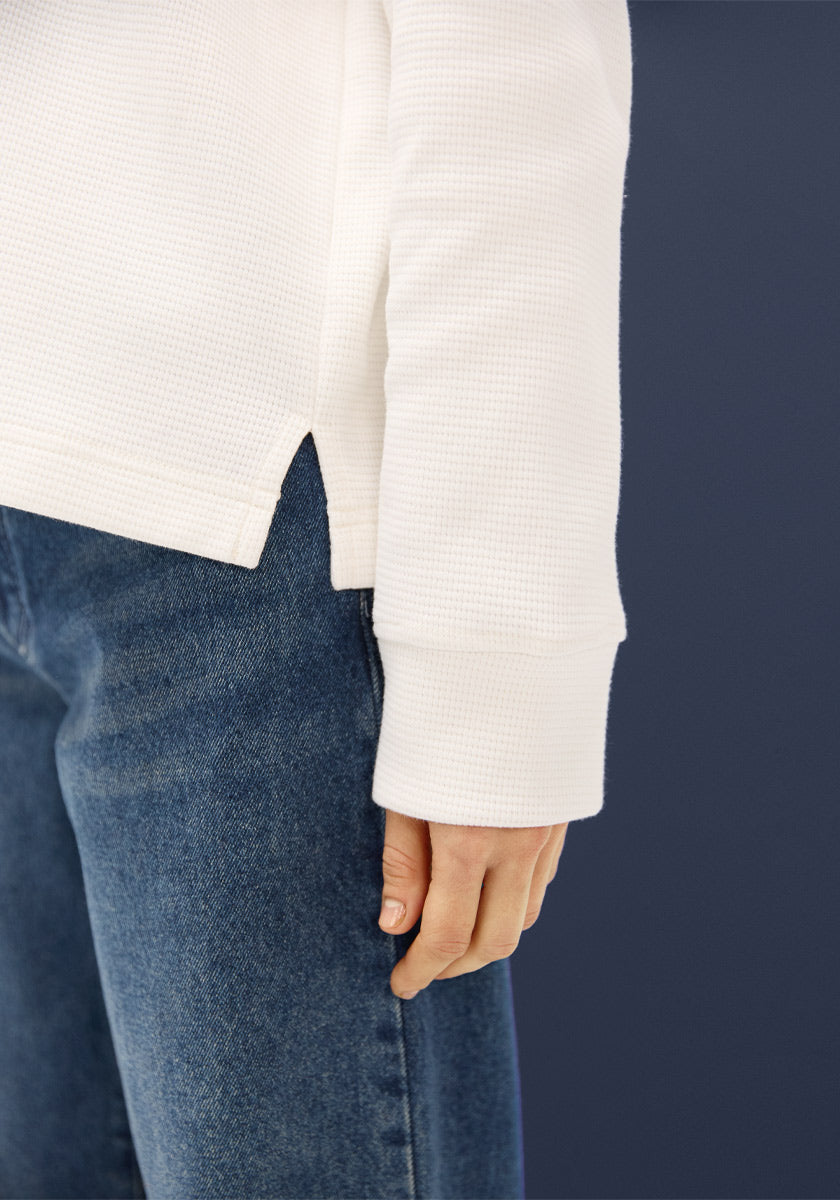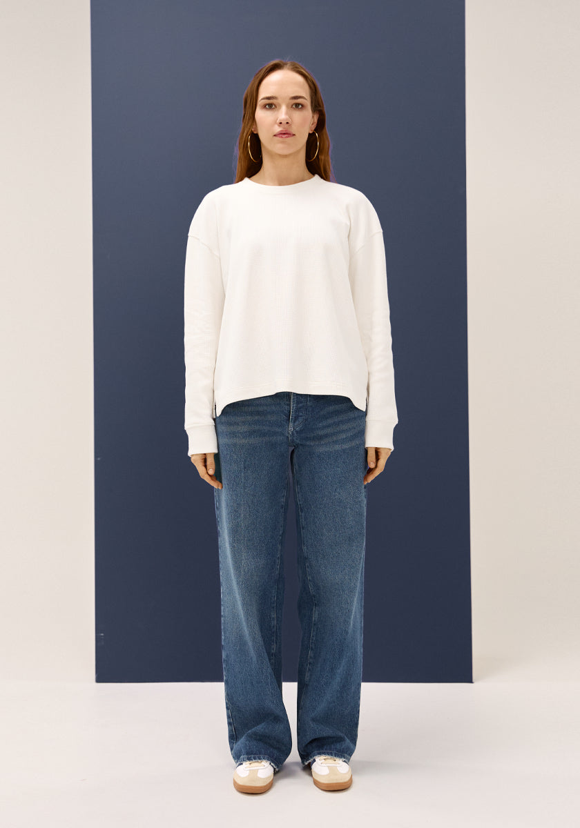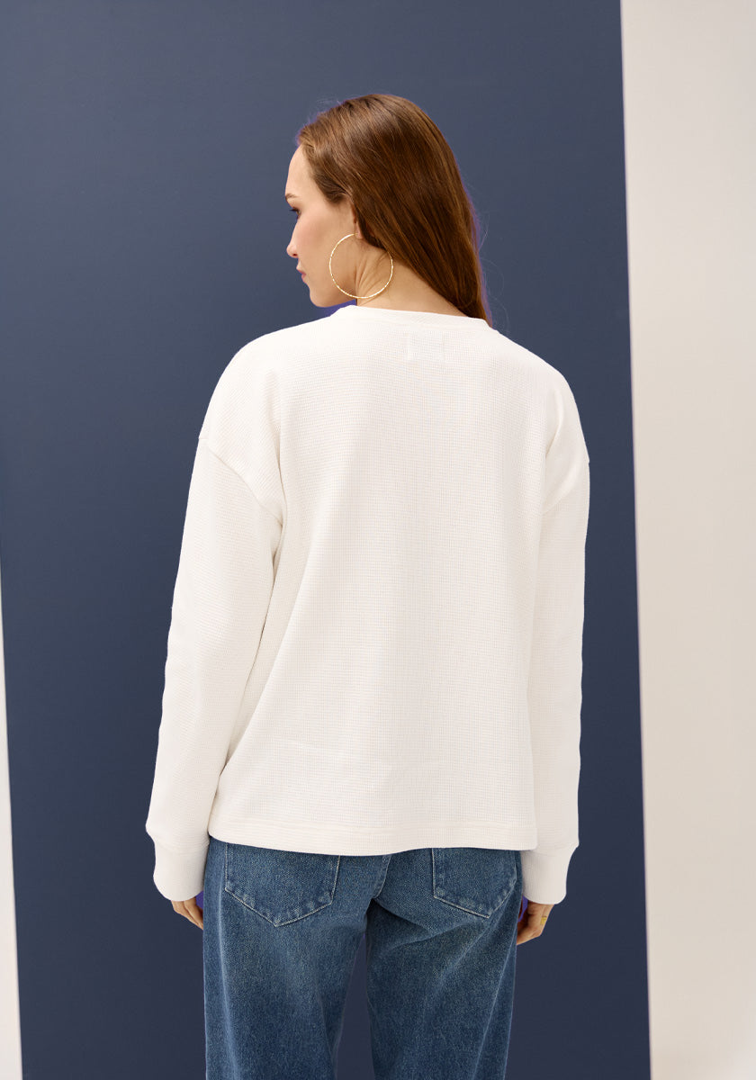 Sa coupe confortable et son tissu nid d’abeille apportent texture et caractère à une pièce volontairement simple. Le blanc waffle éclaire la silhouette et s’intègre naturellement à tous les looks.