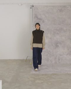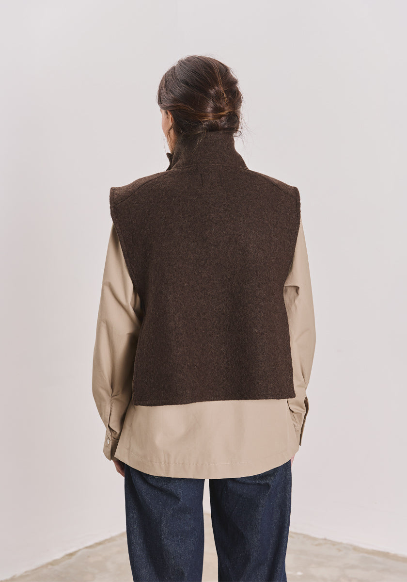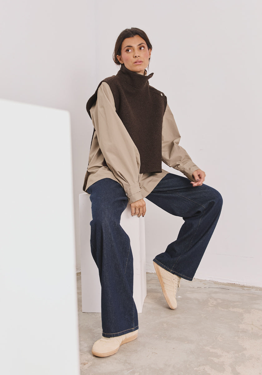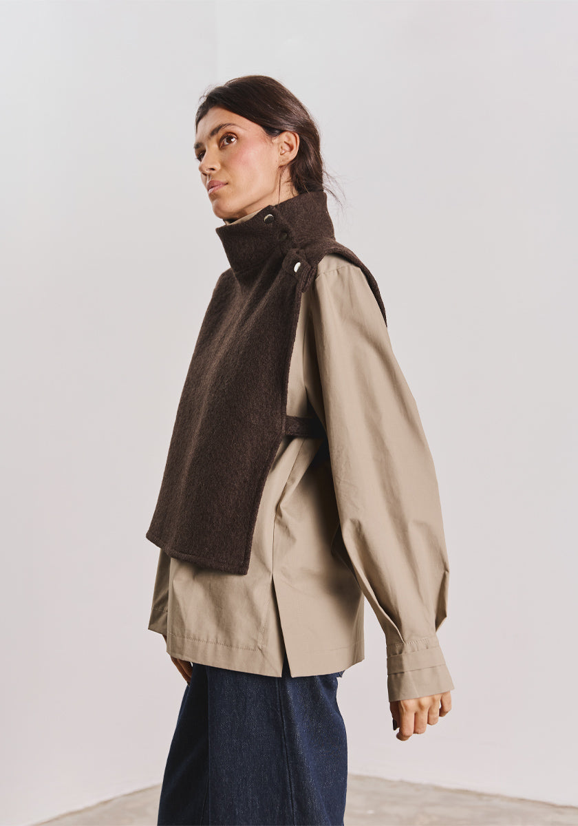 Confectionné dans une laine épaisse, PAZ conserve son effet plastron iconique tout en gagnant en structure et en relief. Son col montant et ses pressions aux épaules en font une pièce à la fois graphique et intemporelle.