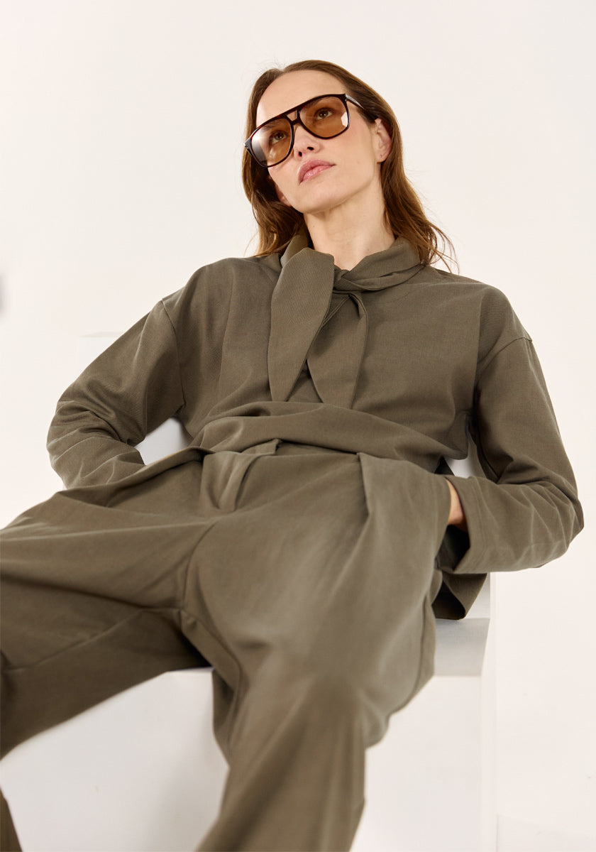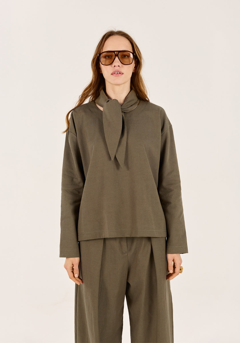 Confectionné dans un tissu européen épais et structuré, il se distingue par son col à nouer cousu sur l'avant, un détail raffiné qui signe la féminité. Ses emmanchures basses et sa coupe droite dessinent une silhouette moderne et fluide. Le coloris kaki apporte une profondeur naturelle qui ancre les looks de saison.