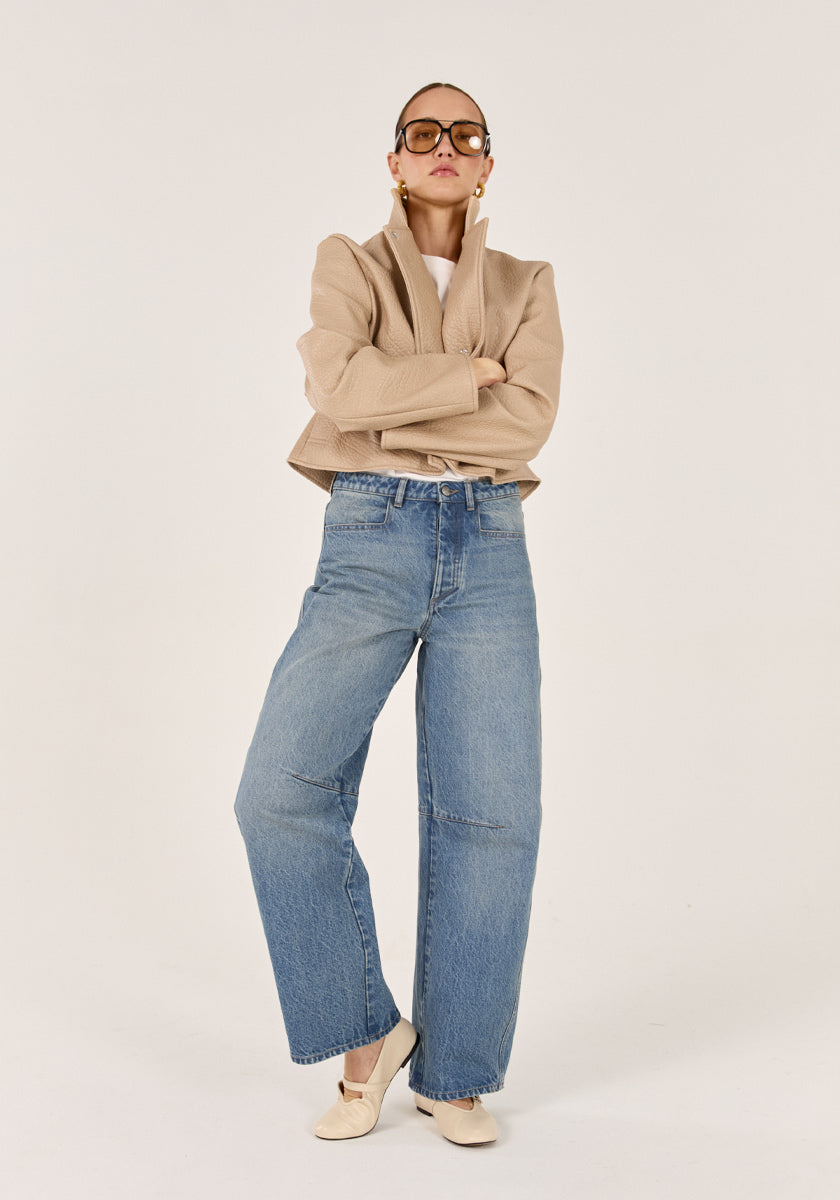 En simili bubble au coloris chamois lumineux, elle se porte fermée avec son col montant ou ouverte pour un effet perfecto affirmé. Ses découpes en biais devant créent un jeu graphique moderne, tandis que les épaulettes marquées et la coupe boxy structurent la silhouette avec caractère. Entièrement doublée de satin et fermée par pressions, CORA incarne la pièce de mi-saison qui élève tous vos looks.