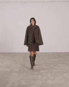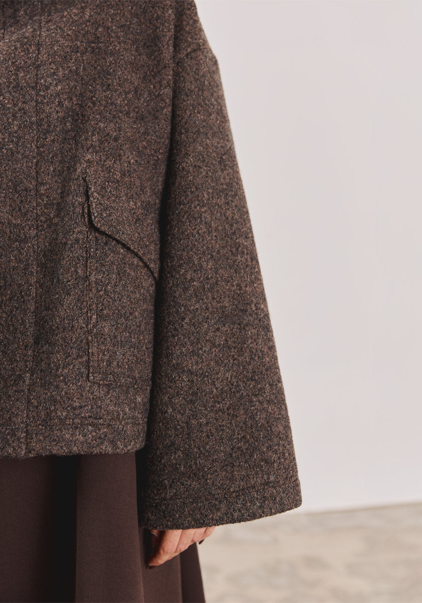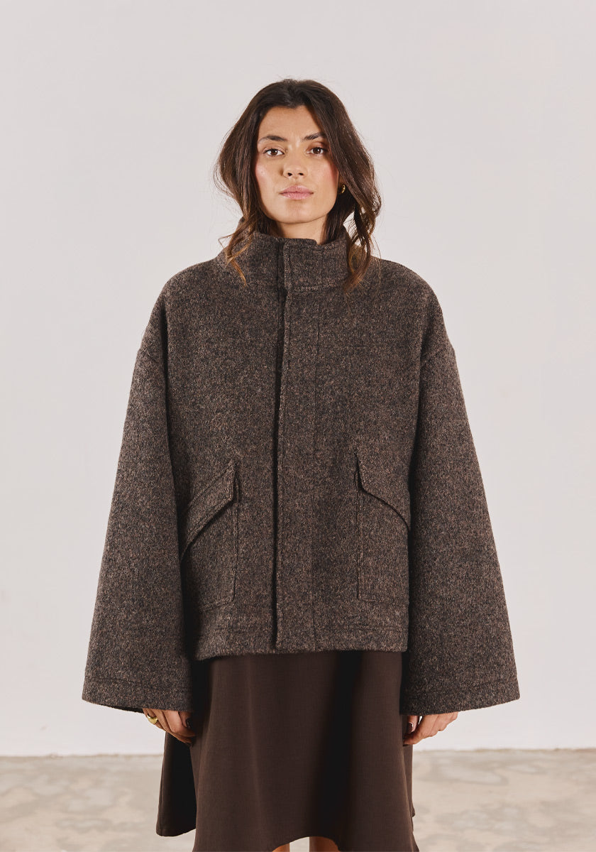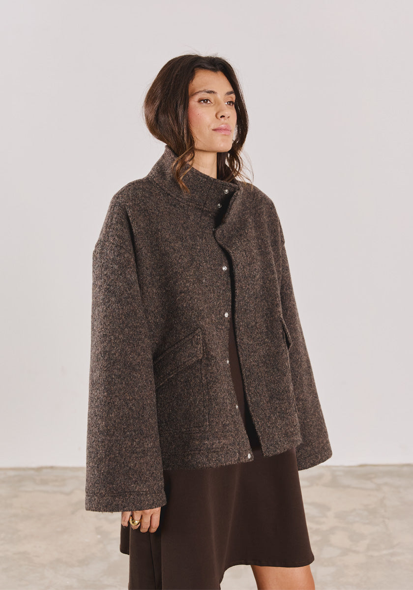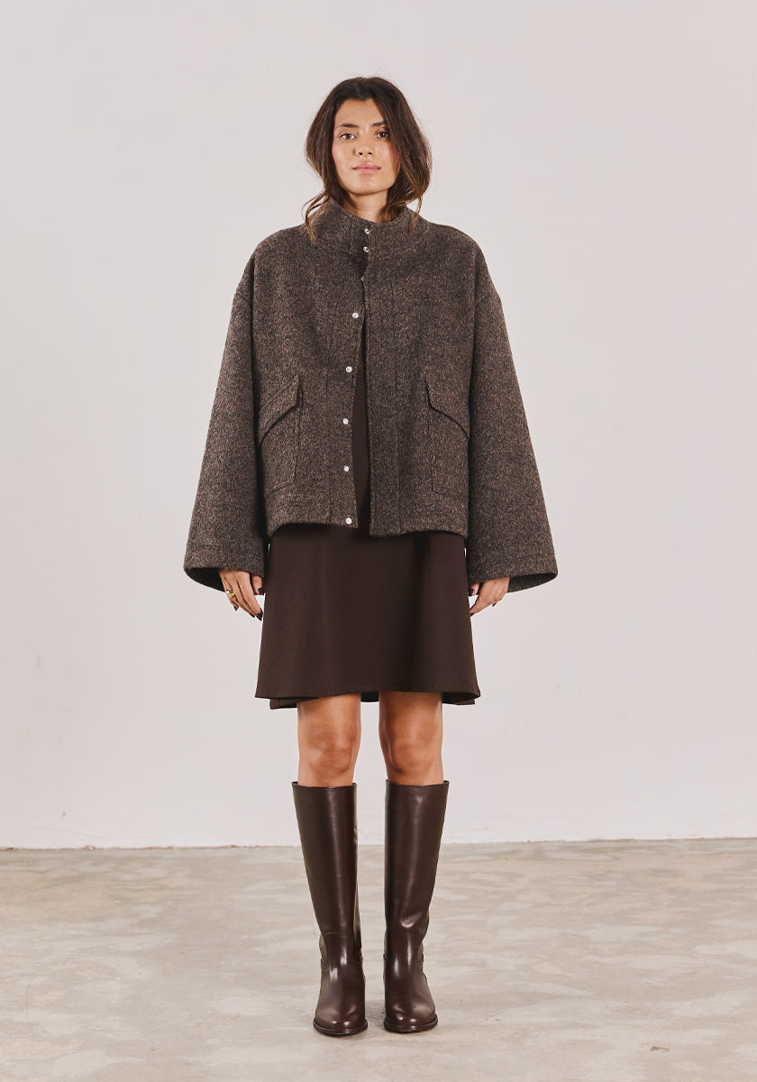 En 100% laine bouillie, CORVO se distingue par sa coupe carrée et ses manches légèrement évasées qui modernisent la silhouette. Son col montant Fennel, ses détails de surpiqûres et découpes en biais apportent caractère et sophistication. Confortable et facile à porter, elle rehausse instantanément n’importe quel look !