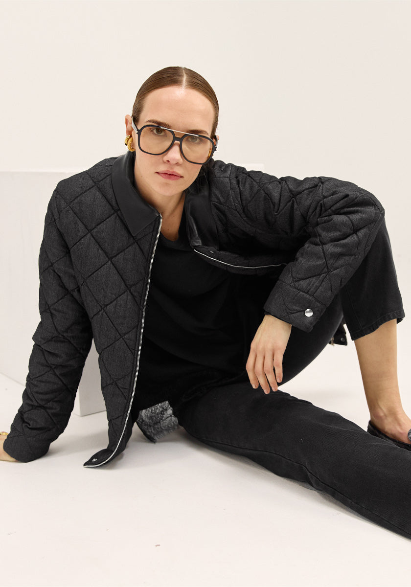Confectionnée en denim matelassé et entièrement doublée de satin, elle allie robustesse et confort avec élégance. Son col en cuiret sa fermeture zippée sur le devant apportent une touche graphique et affirmée, tandis que les poches latérales arrondies et les subtils jeux de découpes signent le soin du détail.