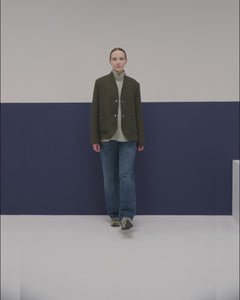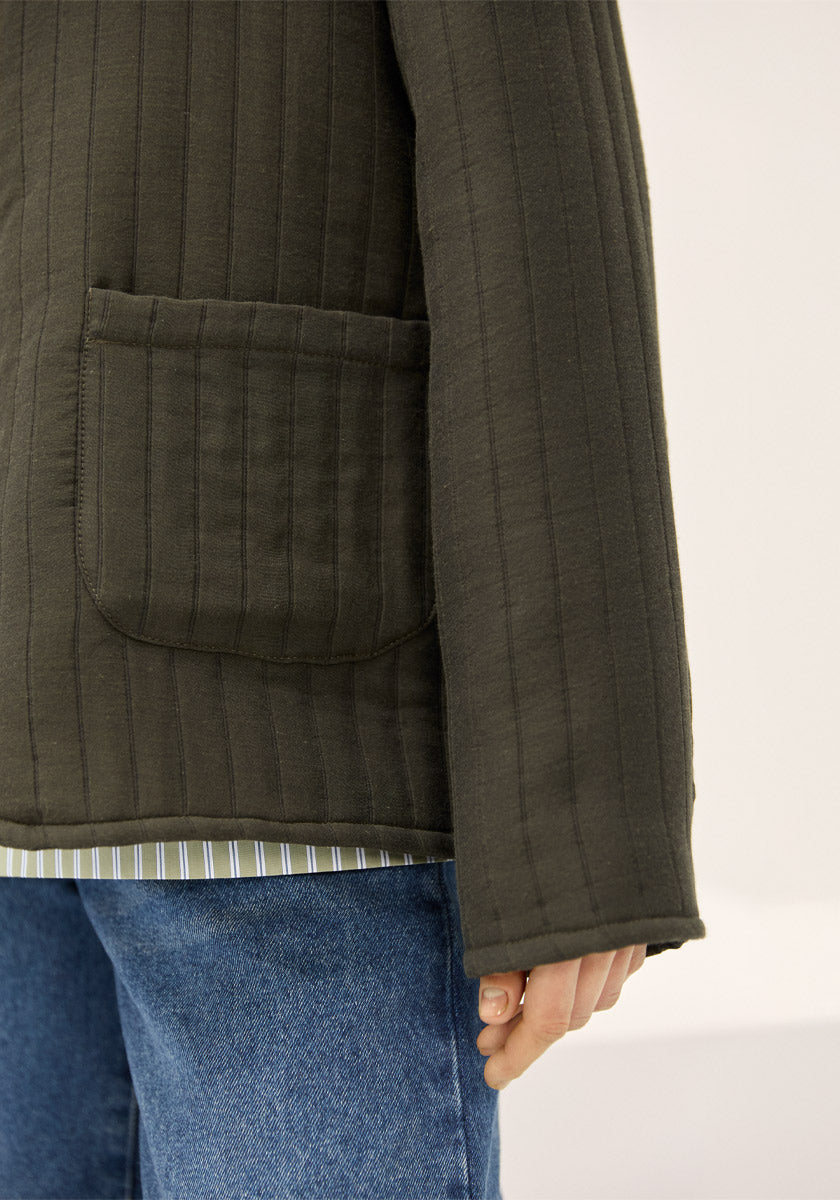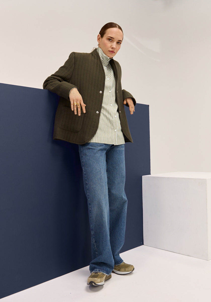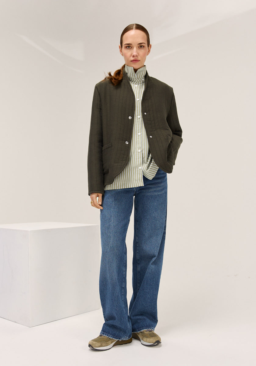 OVANA kaki.Confectionnée dans un tissu jacquard ouaté Français, elle affiche une silhouette esprit japonisant qui structure les tenues avec modernité. Son relief texturé et son tombé impeccable apportent du caractère, tandis que sa doublure intégrale garantit tenue et confort. La pièce forte qui traverse les saisons avec assurance.