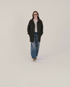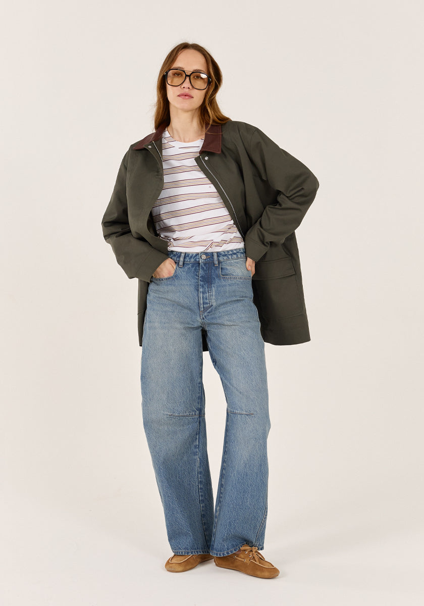 Avec sa longueur mi-cuisse, elle séduit par ses jeux de découpes à l'avant et son col en cuir signature. Confectionnée en tissu déperlant d'origine européenne et entièrement doublée, RODE allie technicité et élégance. Ses poches plaquées à rabat et ses pattes aux poignets apportent des détails utilitaires raffinés. La pièce forte qui traverse les saisons avec caractère.