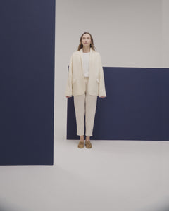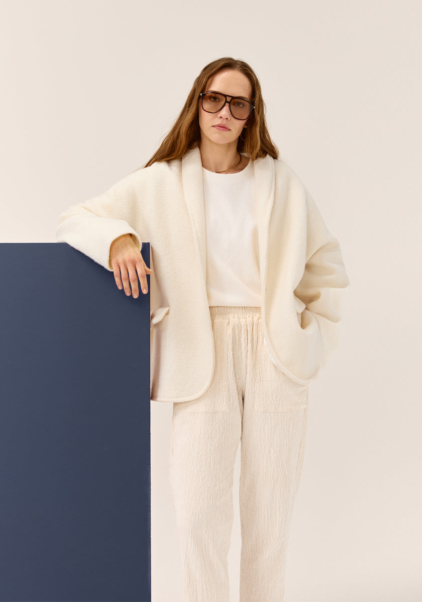 SINES cream, la veste de mi-saison qui structure vos superpositions. Confectionnée en laine bouillie 100%et entièrement doublée, elle offre une coupe loose aux emmanchures basses qui libère les mouvements. Son col châle et ses poches à rabat apportent une touche d'élégance décontractée, tandis que la fente arrière avec découpe signe le détail raffiné. La pièce qui accompagne vos tenues avec justesse.